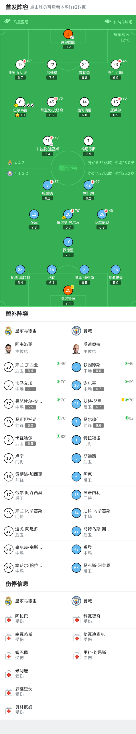 北京时间3月12日欧洲冠军联赛 1/8决赛首回合,皇家马德里对阵曼城。皇家马德里巴尔韦德帽子戏法。最终比分皇马 3-0 曼城。